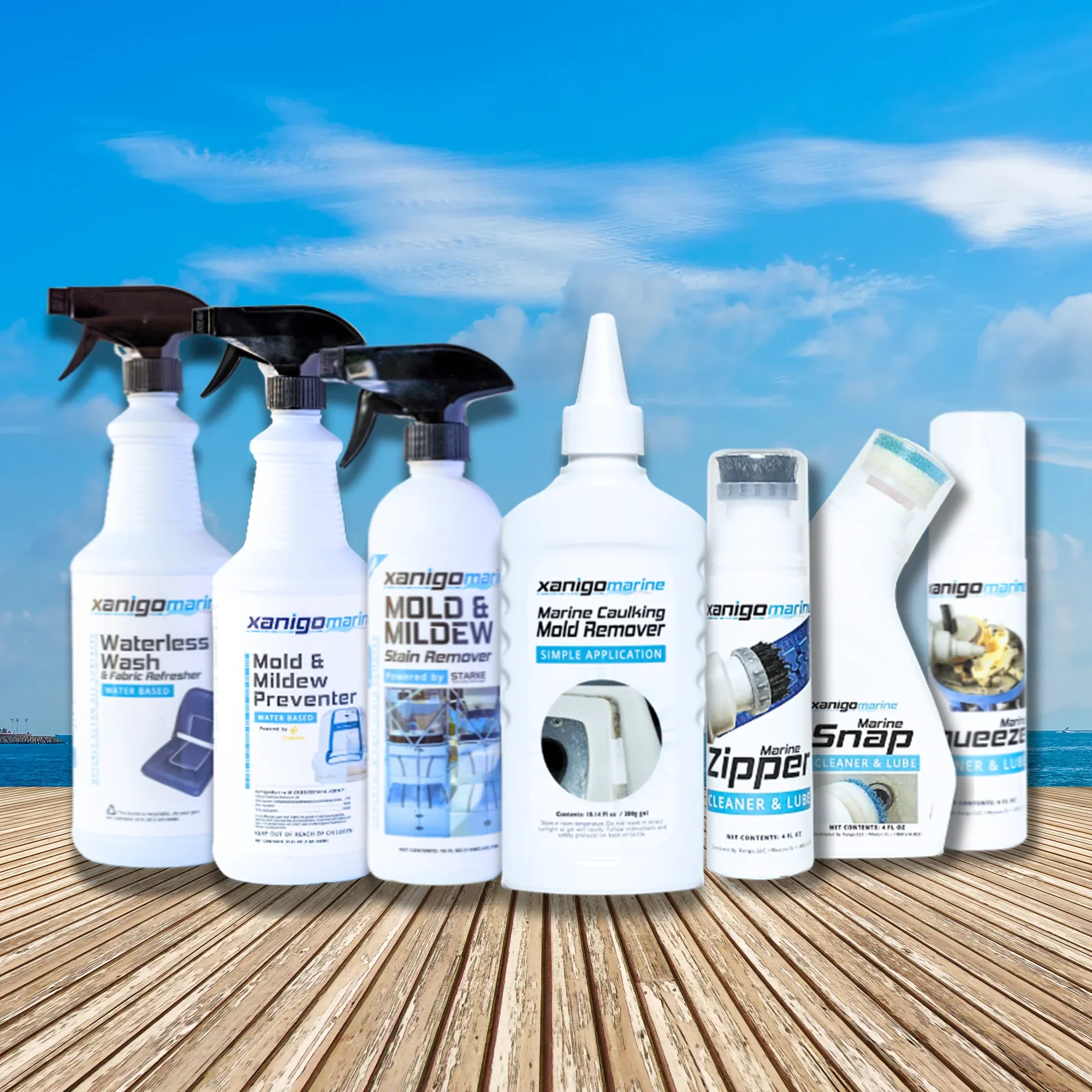 This comprehensive kit includes the Xanigo Marine Mold & Mildew Preventer, Waterless Wash, and the Zipper & Snap Cleaning & Lube Set. For optimal coverage, add the Xanigo Marine Corded Atomizer Sprayer as an optional accessory.